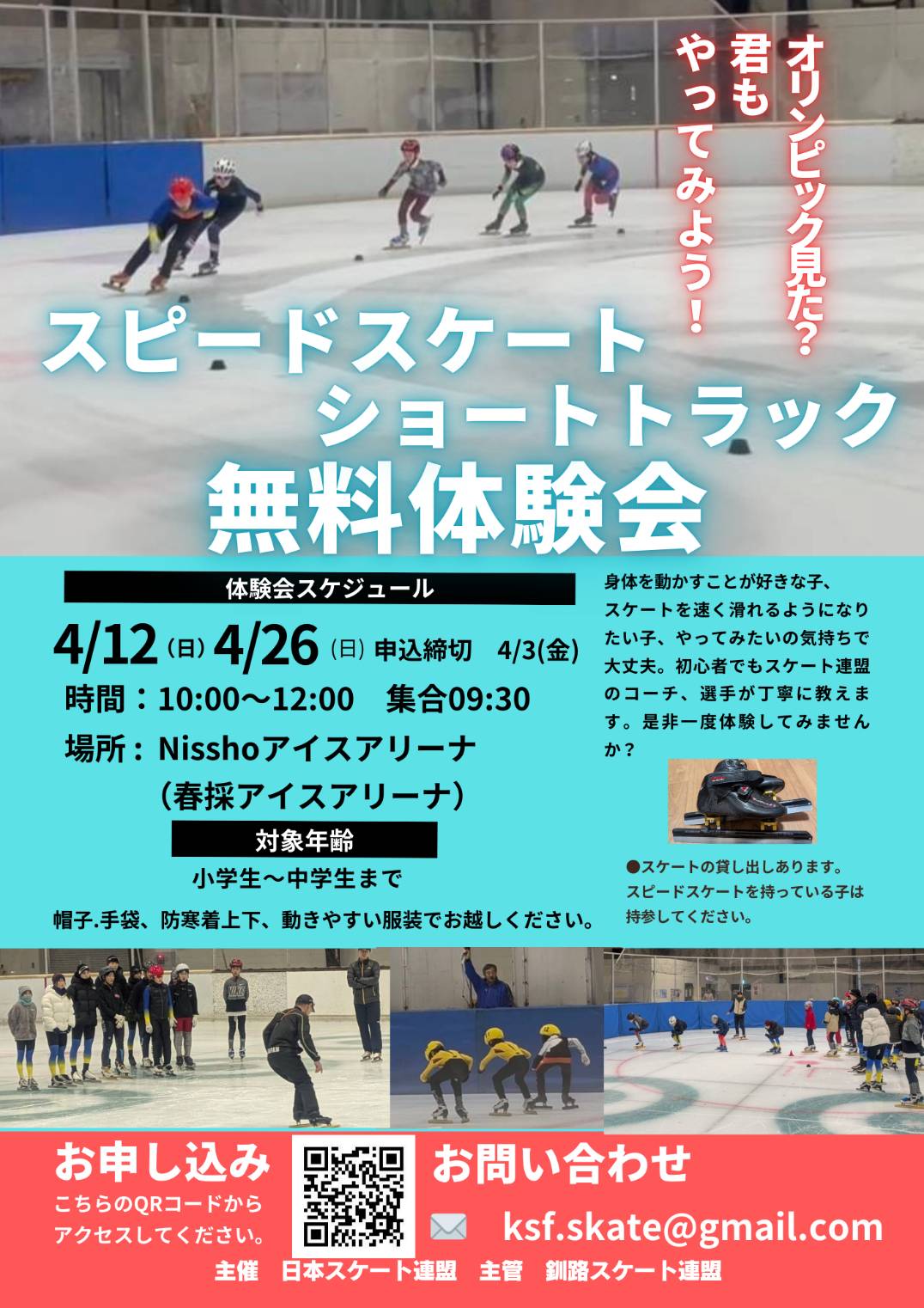 2026年3月24日 / 最終更新日時 : 2026年3月24日 ksf.skate お知らせ JSFショートトラック無料体験会について 日本スケート連盟主催 ショートトラック無料体験会を行います。日時は下記の通りです。 未経験者、初心者の方を中心に行います。定員は20名、問い合わせはQRコードからお願いします。 JSFショートトラック体験会ダウンロード